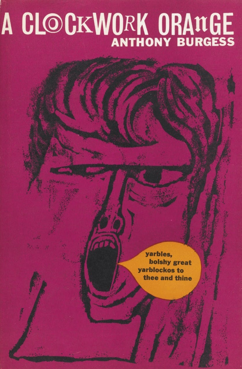 The first edition, published in 1962, features a primal scream by artist Barry Trengrove. The film is but a twinkle in Kubrick’s eye, so for its first decade the book enjoys being entirely untainted by anything other than society’s constant fear of teenagers shouting incomprehensible obscenities.