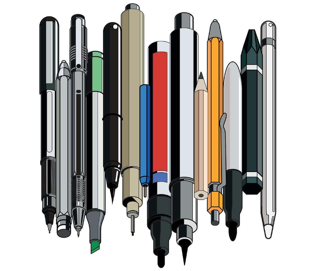 And of course – of course! – it doesn’t matter one jot. A pen, all you need is a pen. Find your own line. Whatever it takes to get the drawing from in here to out there, to make some marks and get ideas down onto … onto … um …