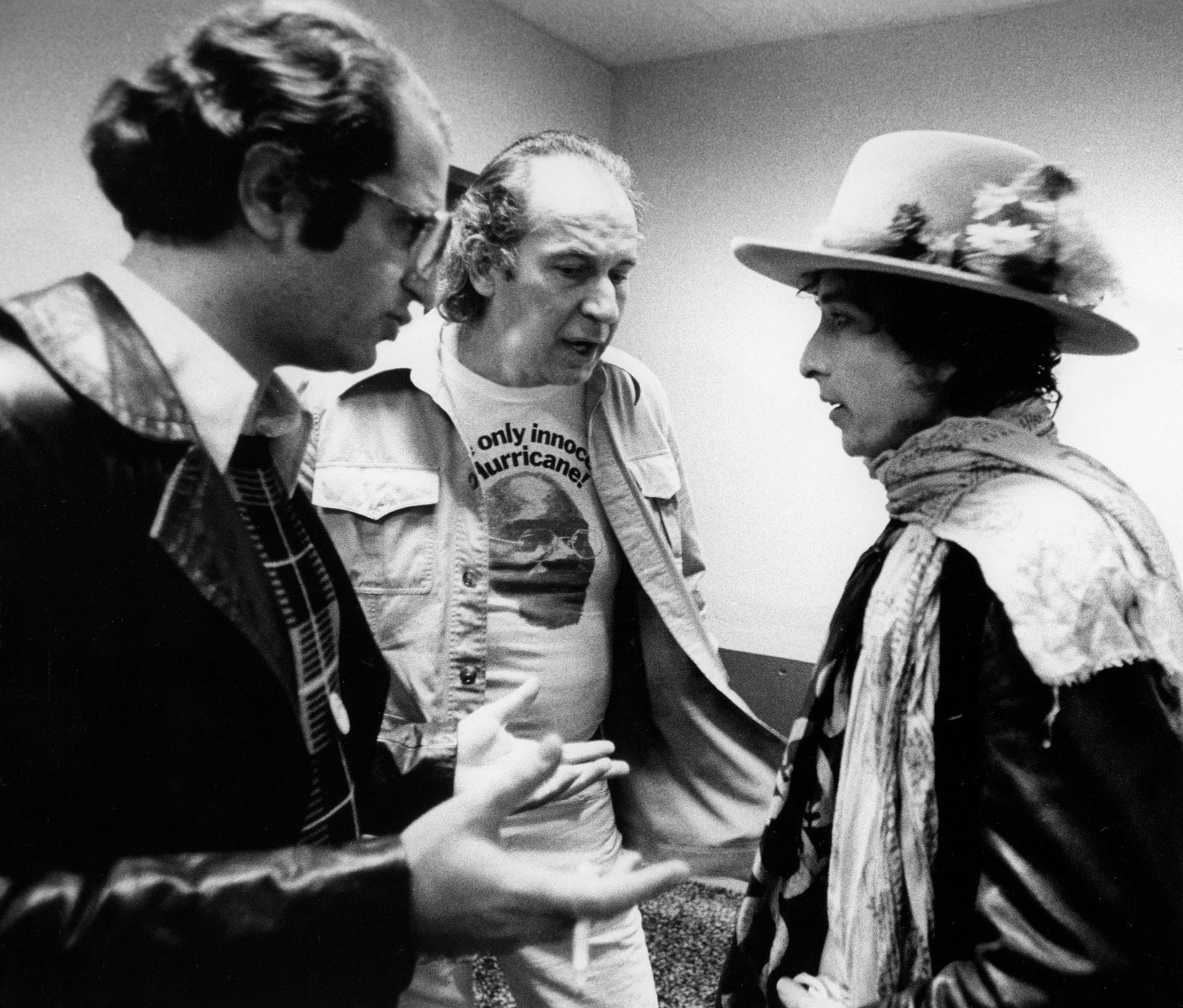 Lois already had public figures such as Muhammad Ali, Johnny Cash, Reverend Jesse Jackson and Norman Mailer supporting the Carter campaign and his idea was to ask Dylan, who had only recently emerged back into public life after a period as a recluse, to write a protest song and then perform it at Madison Square Garden. “A call here, some begging there, and I got backstage at a gig in Connecticut to go eye-to-eye with the passionate poet who I instinctively felt would be in total sympathy with Muhammad Ali and me in an attempt to right a brutal racial injustice,” he writes. “You’re looking at a photo of me and Paul Sapounakis (my co-organiser) doing a Svengali on Dylan, convincing him of Carter’s innocence and goading him to write a song…. A few weeks later he composed Hurricane, protesting Carter’s conviction, and performed it to tremendous emotional response from his young audiences.”