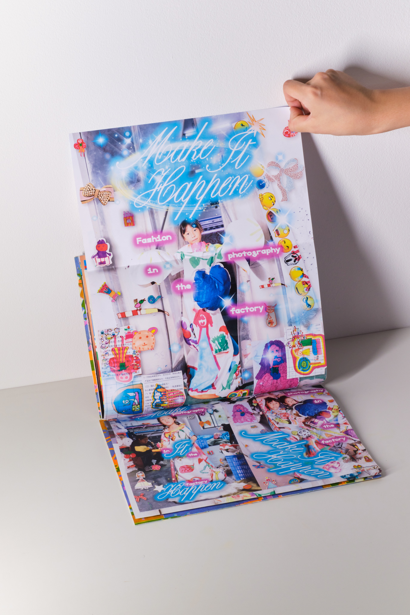 To bring this complex issue to the fore, she began visiting Xinxin and Yu most weekends, bringing her painting tools and working with them to co-create clothes in a ‘mini factory’ they set up in a corner and making the most of the resources in the factory environment – “transforming high-efficiency industrialised machines into tools that allow them to see their talents”. Working with them over two years, she divided the creative process into a number of stages, focusing on things like writing, photography, graphics, illustration, fashion design, and book design.