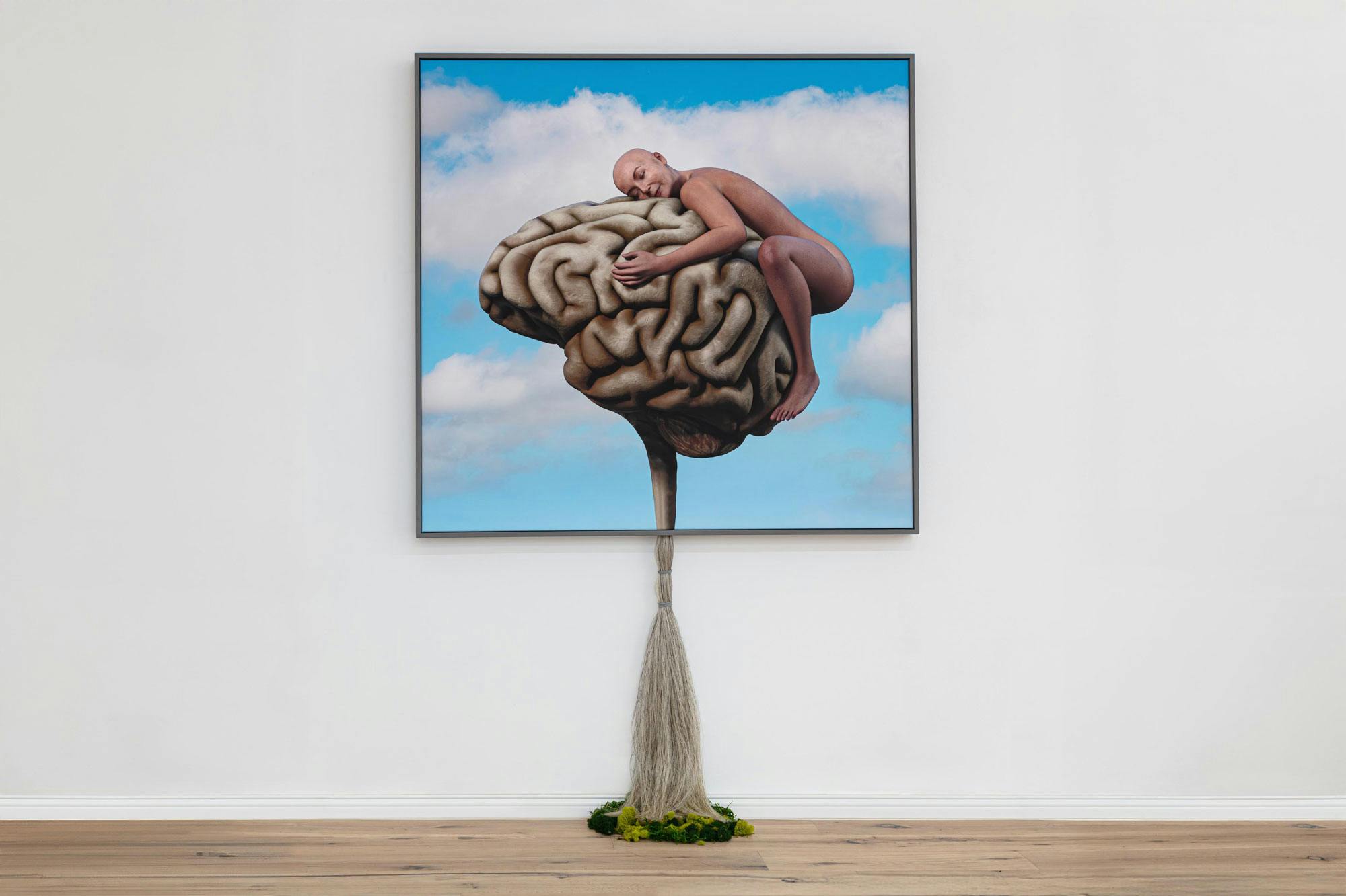 One of her latest pieces, Biophilia (2024), was designed on a computer but, in a first for the artist, is printed on canvas. Depicting her own face mapped onto a generic female body which is embracing a brain, it’s a commentary on our shifting relationship with the natural world. “Biophilia is defined as an innate quality of humans to love nature. This is why when we go out into nature to hike or something, you can feel it affecting you,” she says. “But I look now and I’m thinking, maybe we don’t really have a love of nature. If we do, why are we destroying it all?”