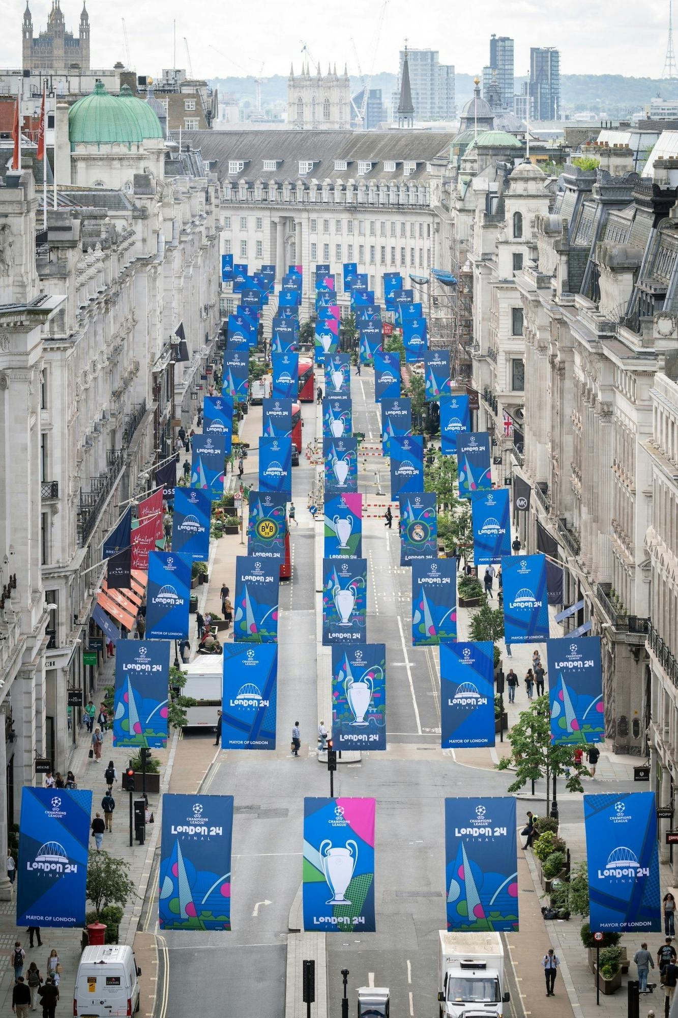 That said, Lowe is no stranger to embracing new avenues for expression. Visit his Instagram and in one post he’s making an improvised drawing in a video filmed from above, created using a seven-circle stencil, a protractor and a children’s Safe-T compass (it has no sharp point); then he’s posting a series of pictures of banners stretching the length of London’s Regent Street, each one featuring graphics that Lowe designed for the UEFA Champions League final that the city hosted in June this year.