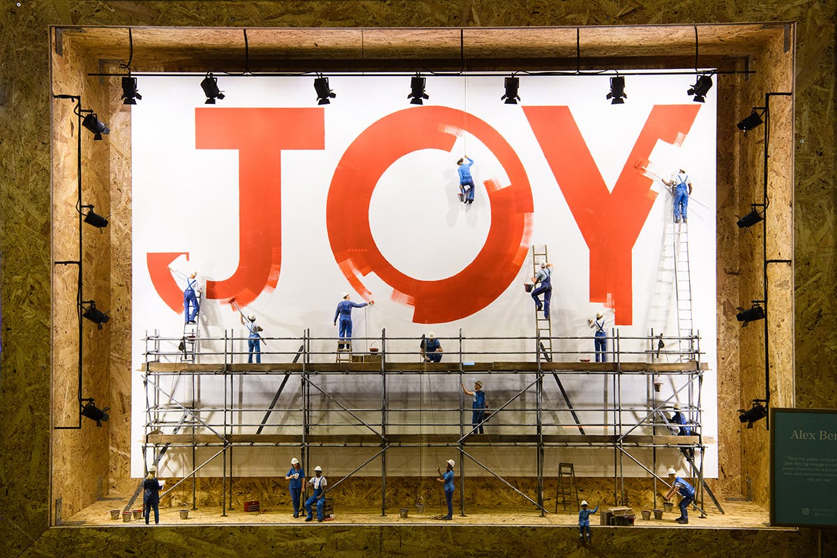 The historic department store hired six artists who work in theatre and set design to create cheery window displays