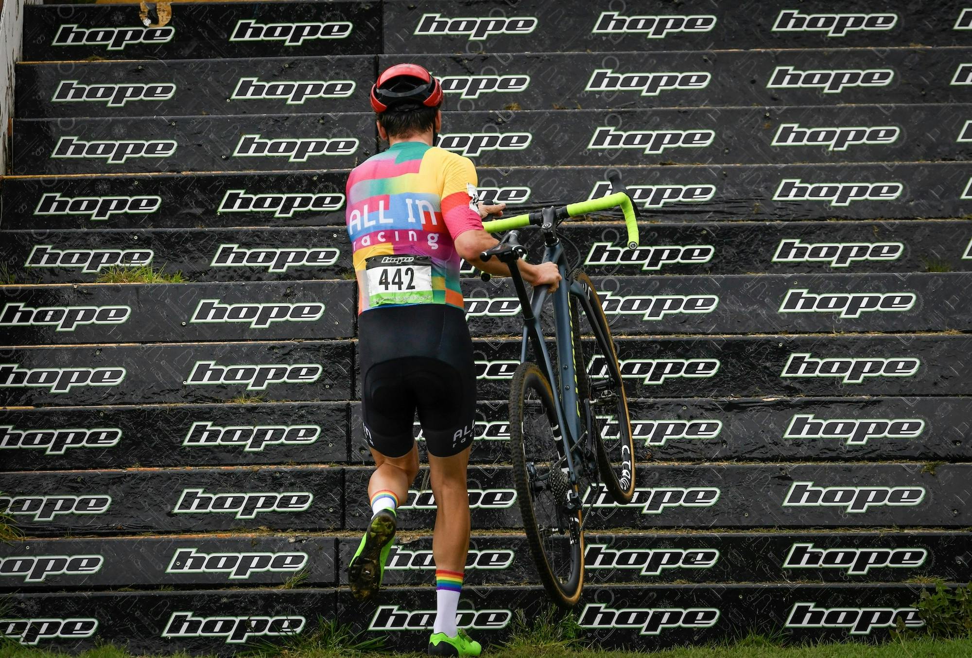 Proceeds from the socks part-funded sponsorship of the UCI 2022 Andover Supercross event, and like any race sponsor, All In’s logo ran on banners surrounding the course, visible in event photos shared afterwards. At a time when cycling sponsorship is drying up, this event was notably the “first internationally sanctioned race that was explicitly funded by LGBTQ+ people and allies – and was a race that wouldn’t otherwise have happened without our support”, he adds.