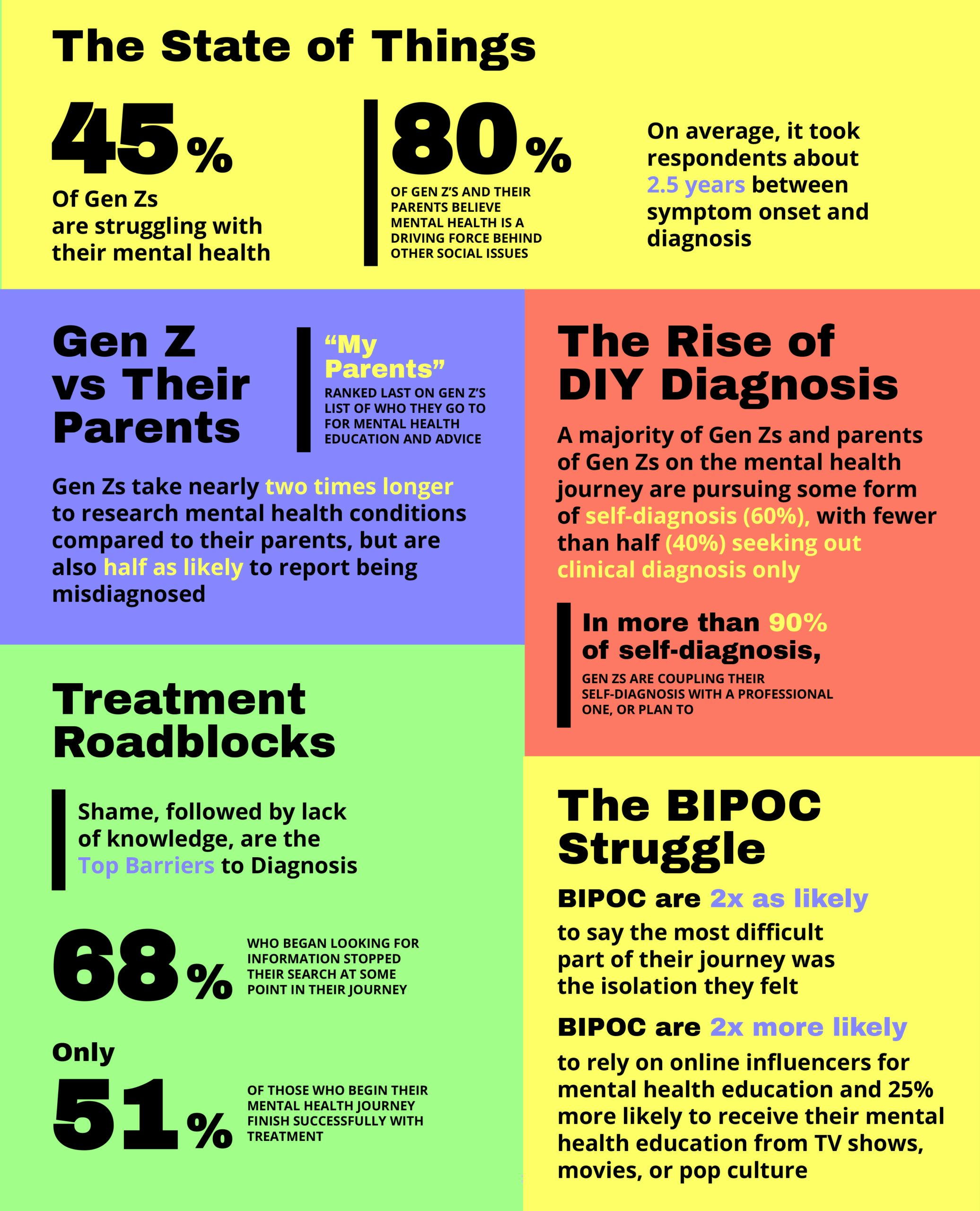 So what does the report uncover? Well, among its conclusions, the data produced suggests that while the majority (60%) of Gen Zs are self-diagnosing using the internet as a research tool, 90% are then looking to pair their self-diagnosis with a professional one. At the same time, Gen Z’s DIY self-diagnosis path is also proving more effective: they take nearly twice as long to research mental health conditions than their parents do, but are also half as likely to report receiving a misdiagnosis.