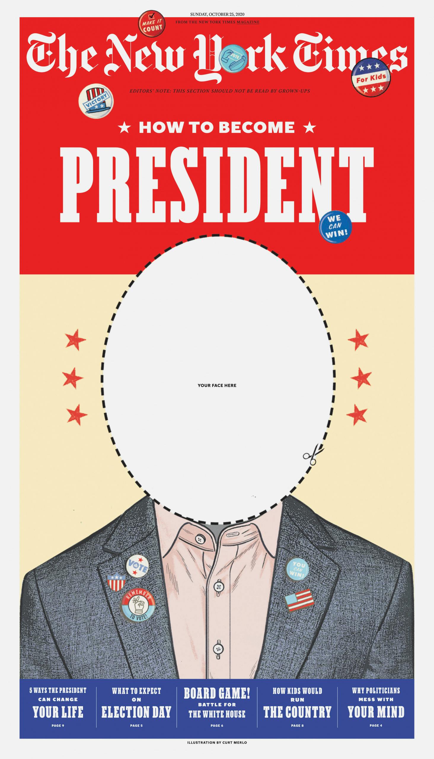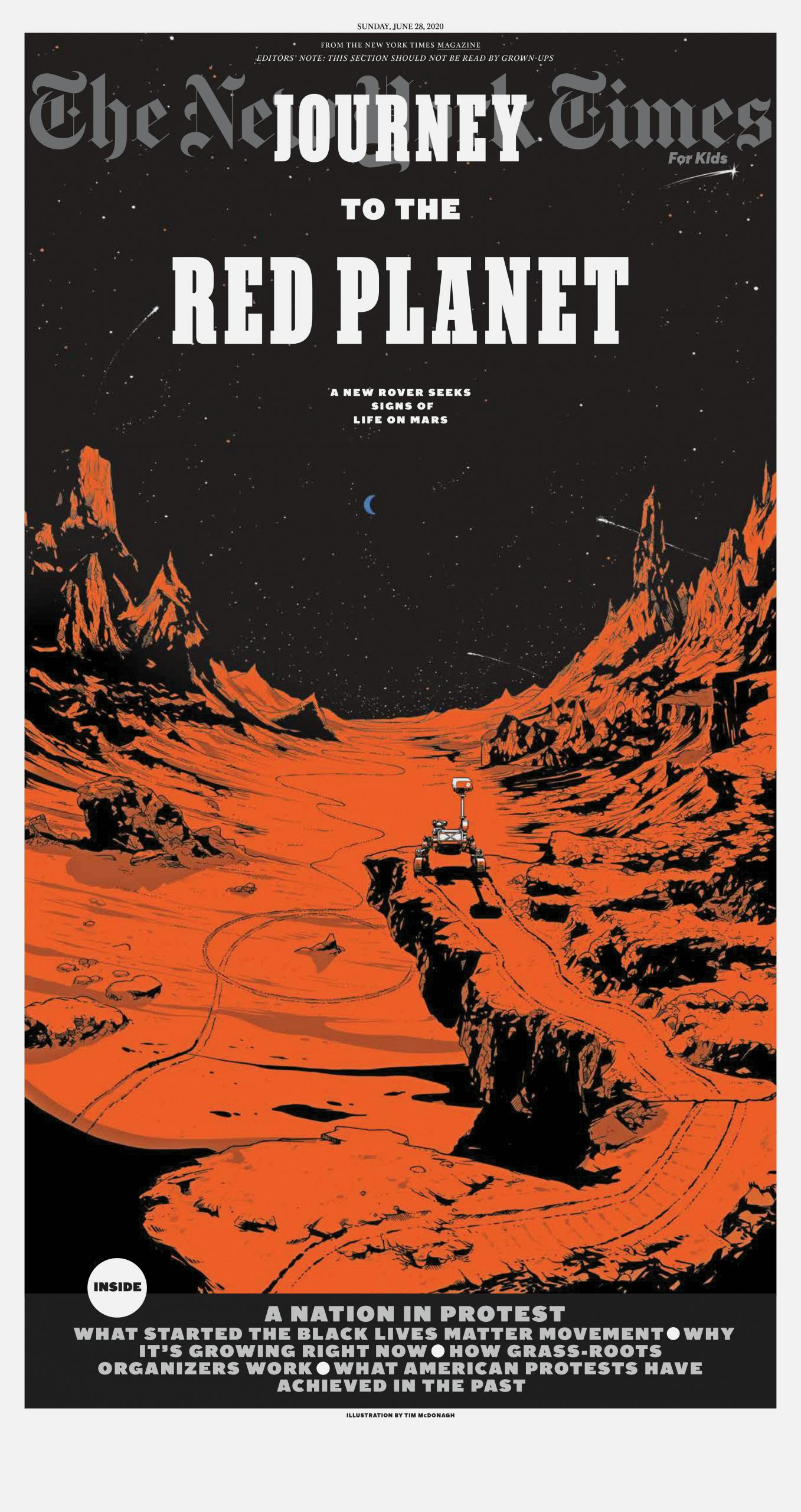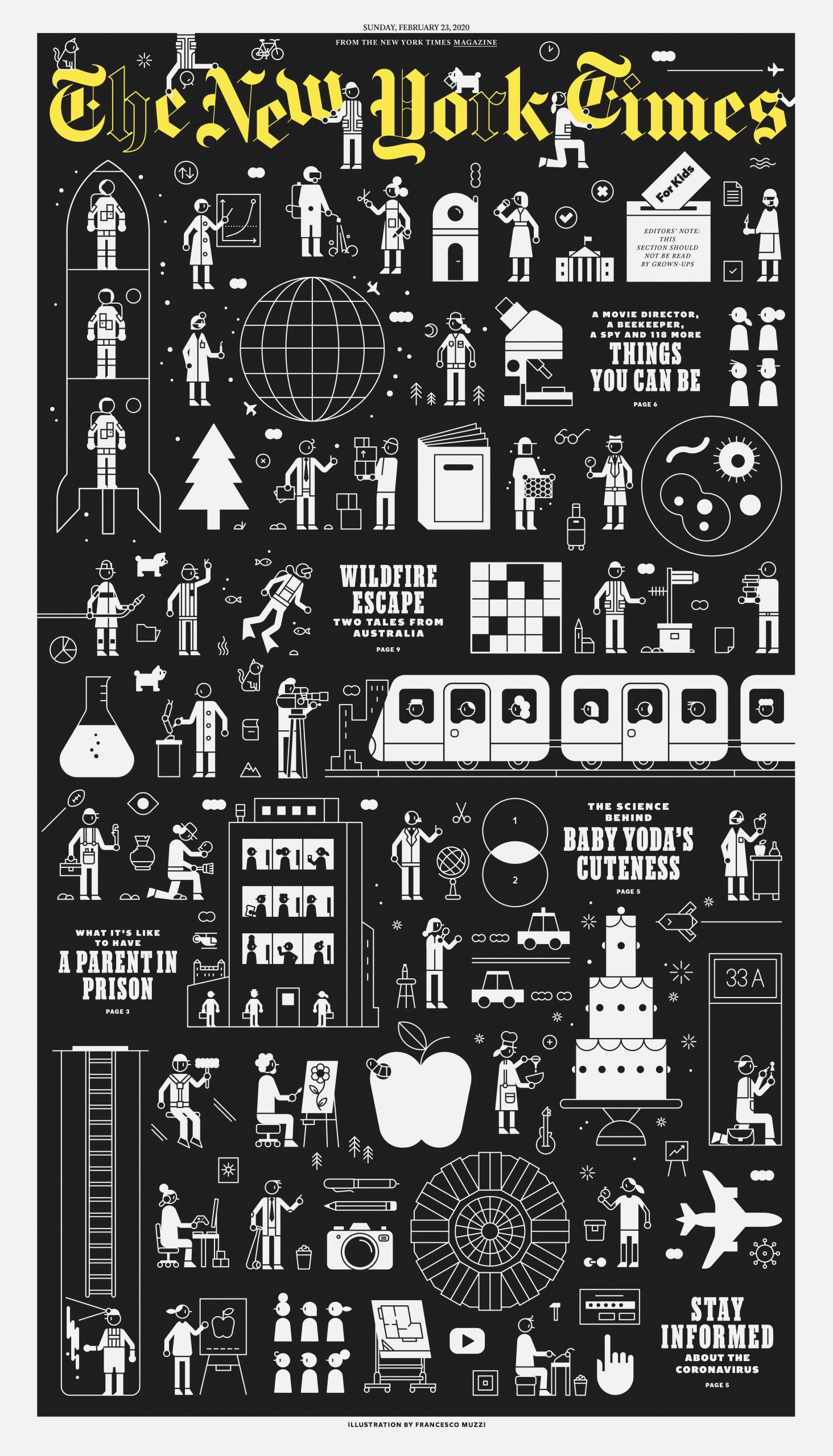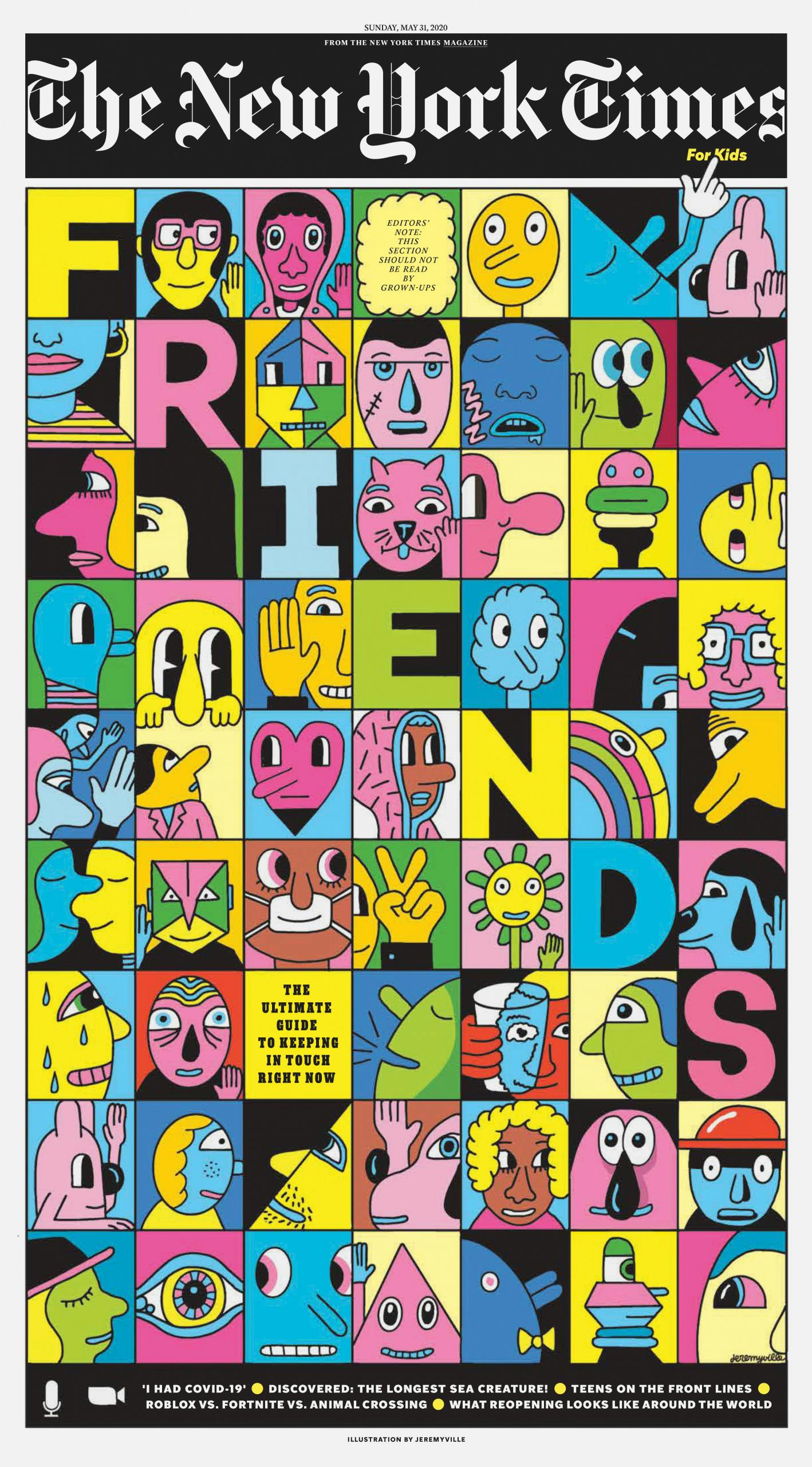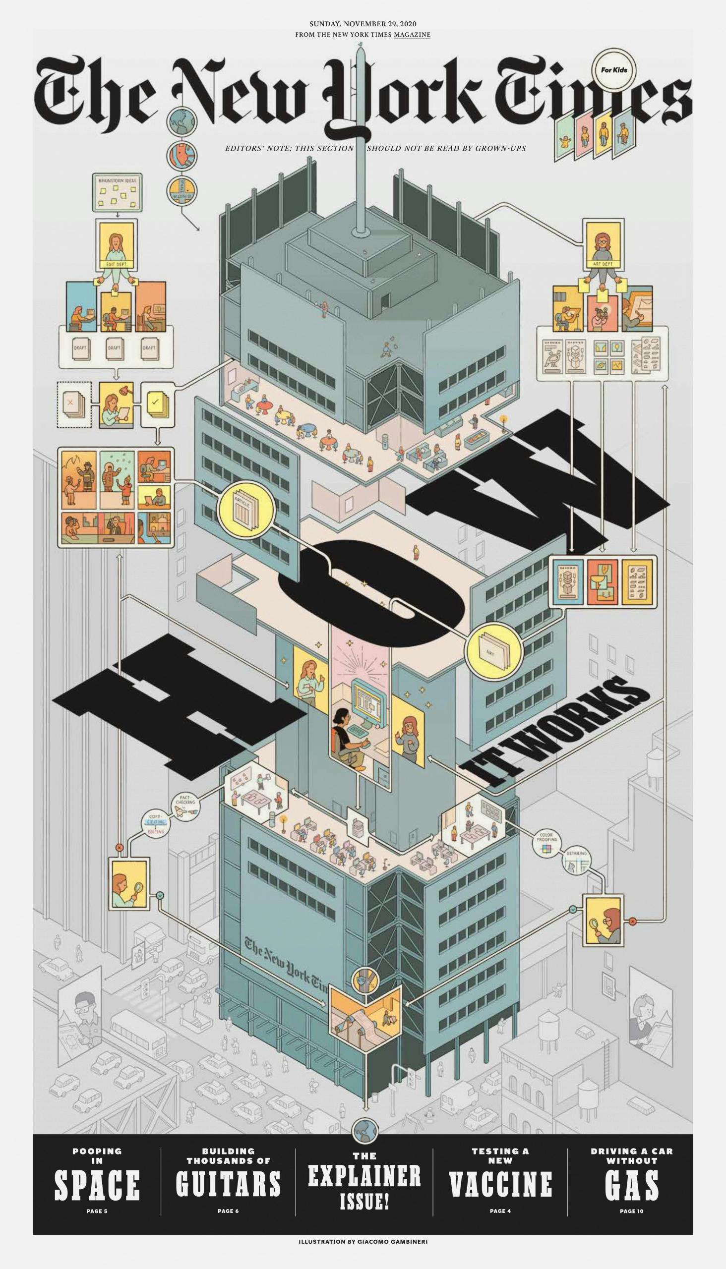 “The cover needs to simultaneously feel on brand for kids, be appropriate for the New York Times, and also be an image that will set up the theme for the issue,” says Bishop. “I tend to prefer creating a cover that will make a beautiful poster but that has the power of a great magazine cover. What we do beautifully is to exploit the huge scale of the broadsheet and combine it with the ingenuity of magazine storytelling.”
