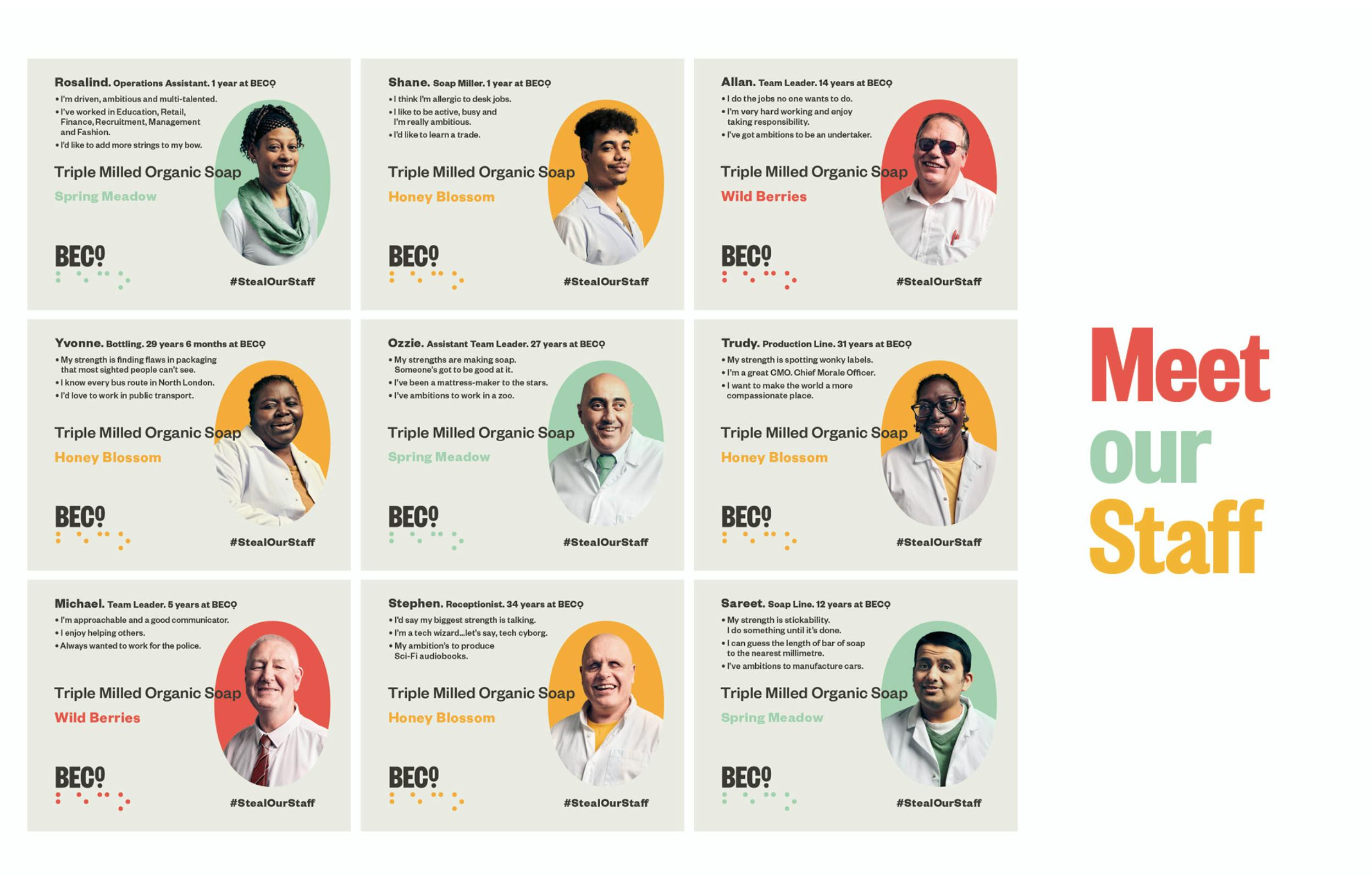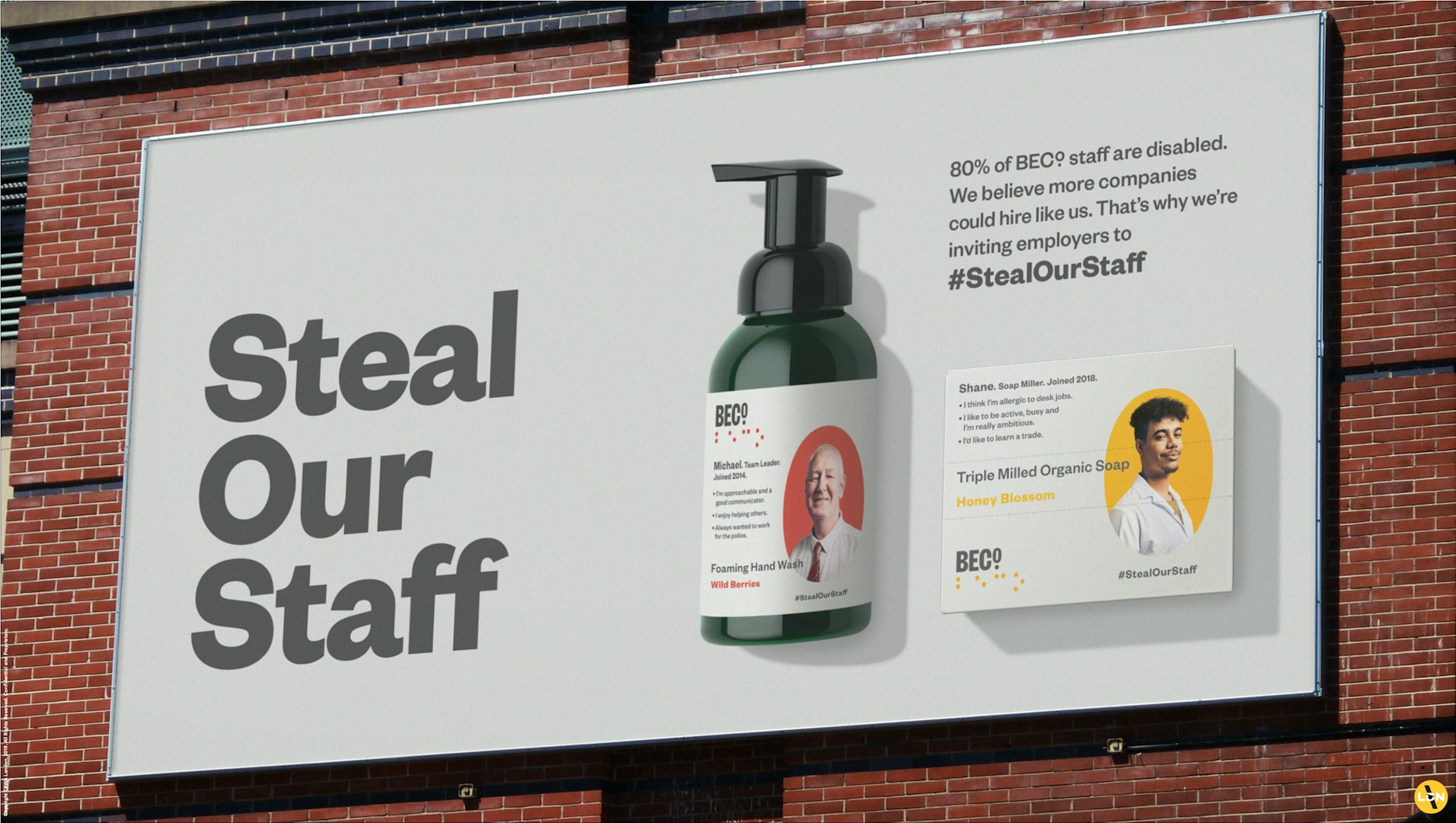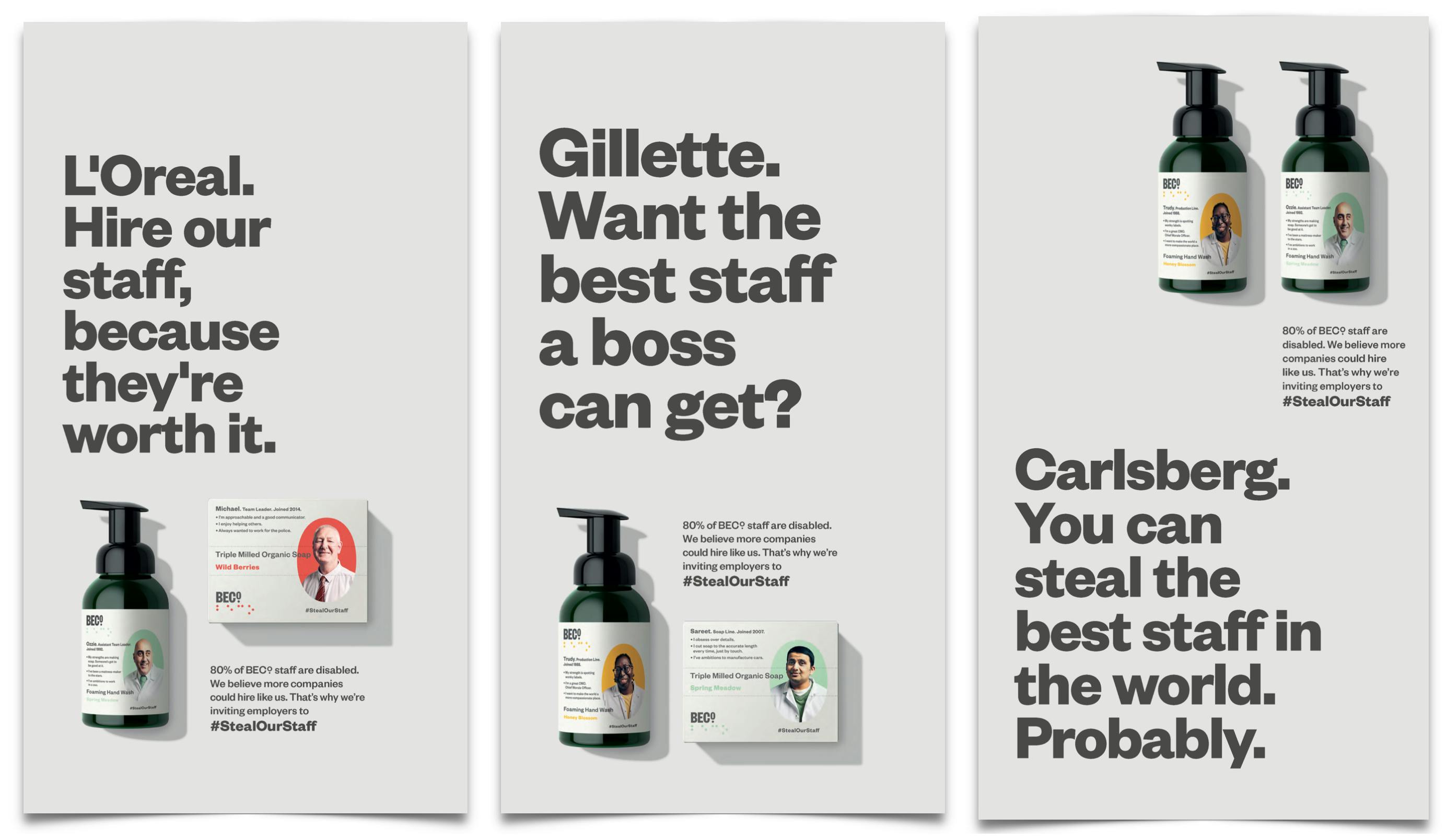 The campaign was created by TBWA\London, which had already been working with Beco on getting its products stocked in leading retailers such as Boots, Waitrose and Sainsbury’s. The brand includes organic, paraben-free and plastic-free toiletries in its range, but it is the people that make Beco what it is. With 80% of its workforce disabled, disadvantaged or visually impaired, the social enterprise is gunning for change when it comes to the disability employment gap sustained by the biased hiring practices of many businesses. It’s a widespread issue that seems missing from wider discourse, which is what #StealOurStaff set out to change.