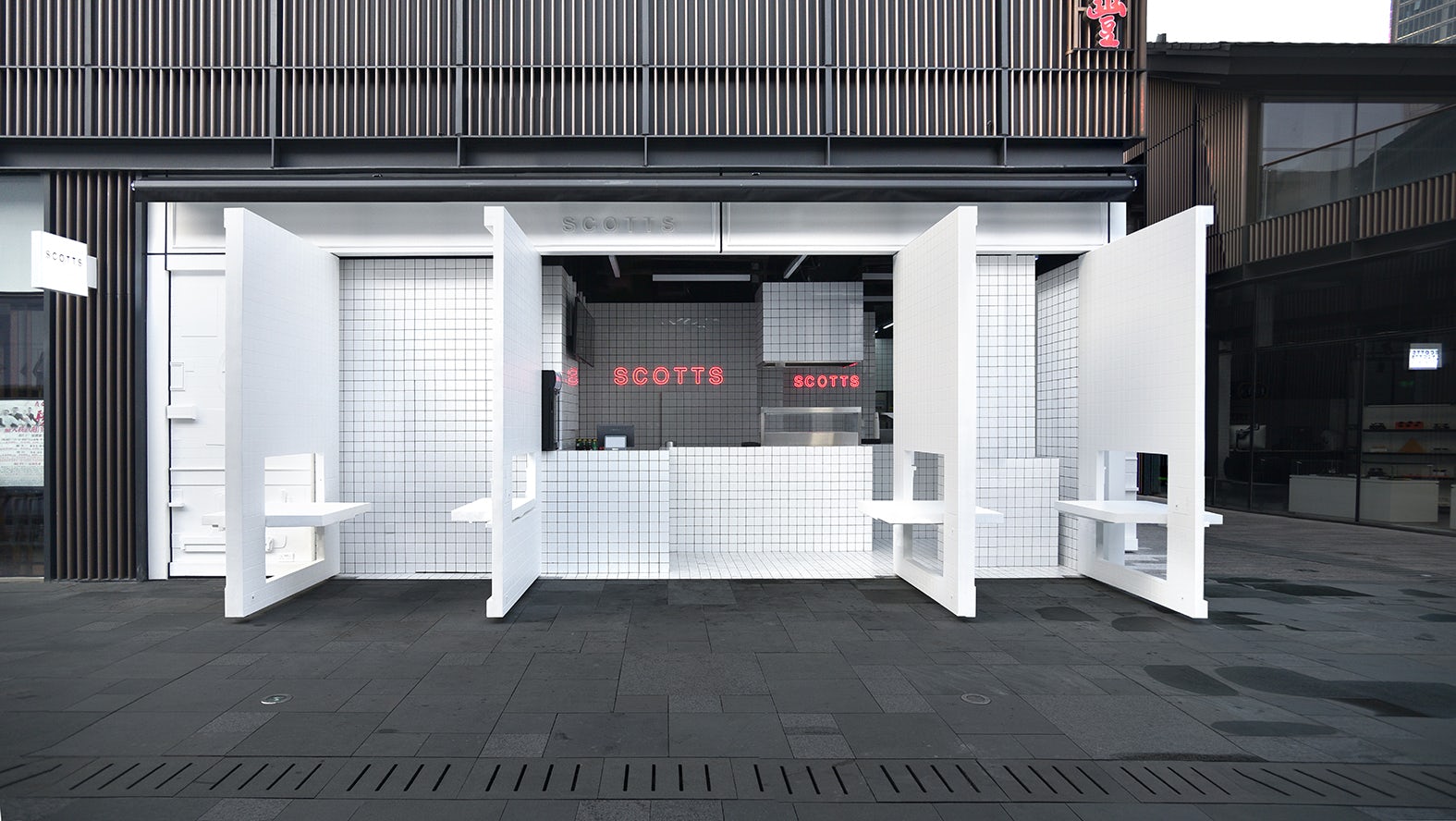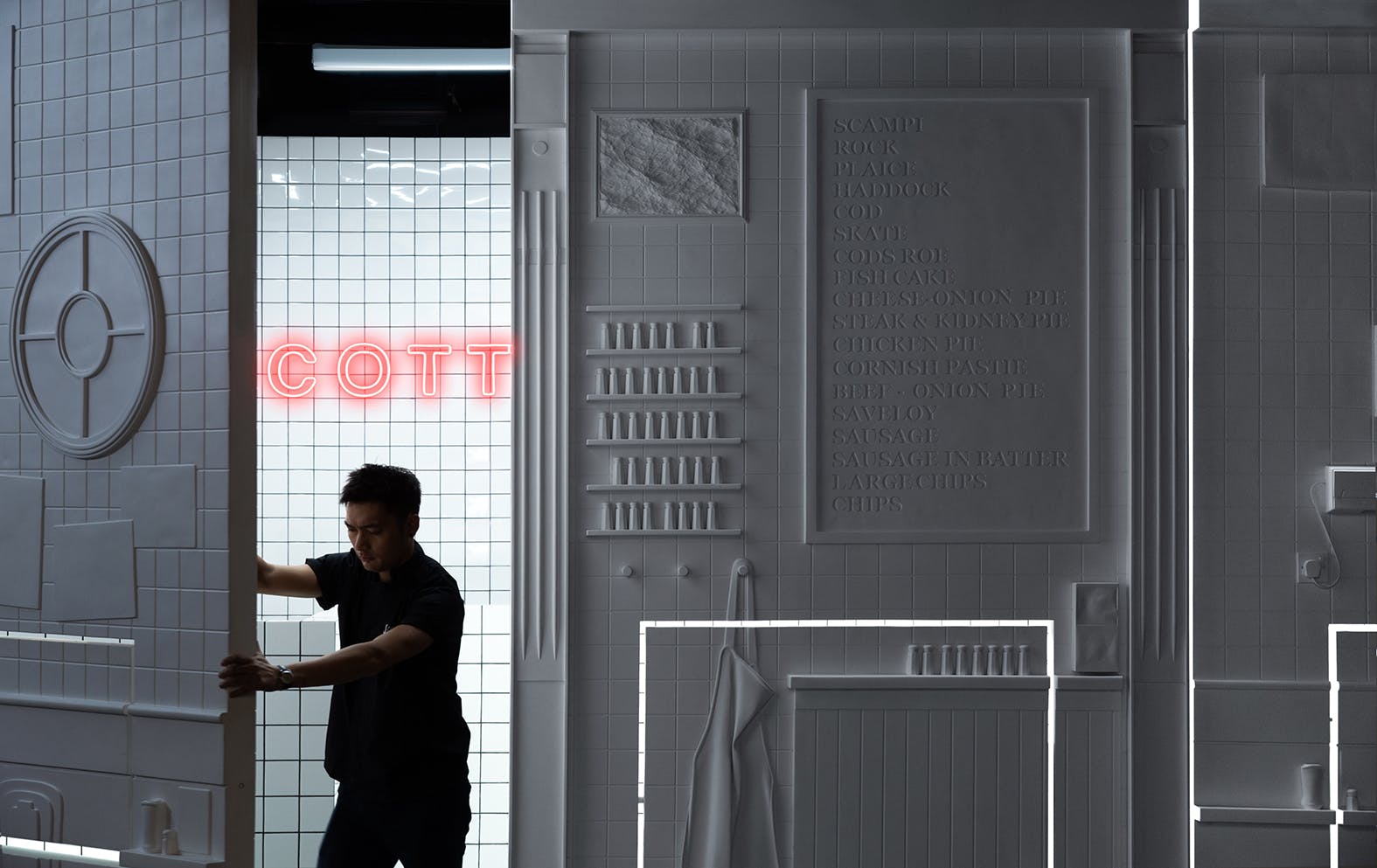 At the end of it – and after a lot of free portions of cod and chips – they’d built up a library of objects, surfaces and architectural fragments from the shops. Taking elements from this, Unknown Works designed a foldable façade for Scotts Chengdu, which is dotted with details most British people will recognise. There is, of course, the white tiles that are de rigueur for any chippie worth its salt, but there are also folded aprons, wall menus, decorative bits of plaster, and salt and pepper pots, all embossed onto the surface.