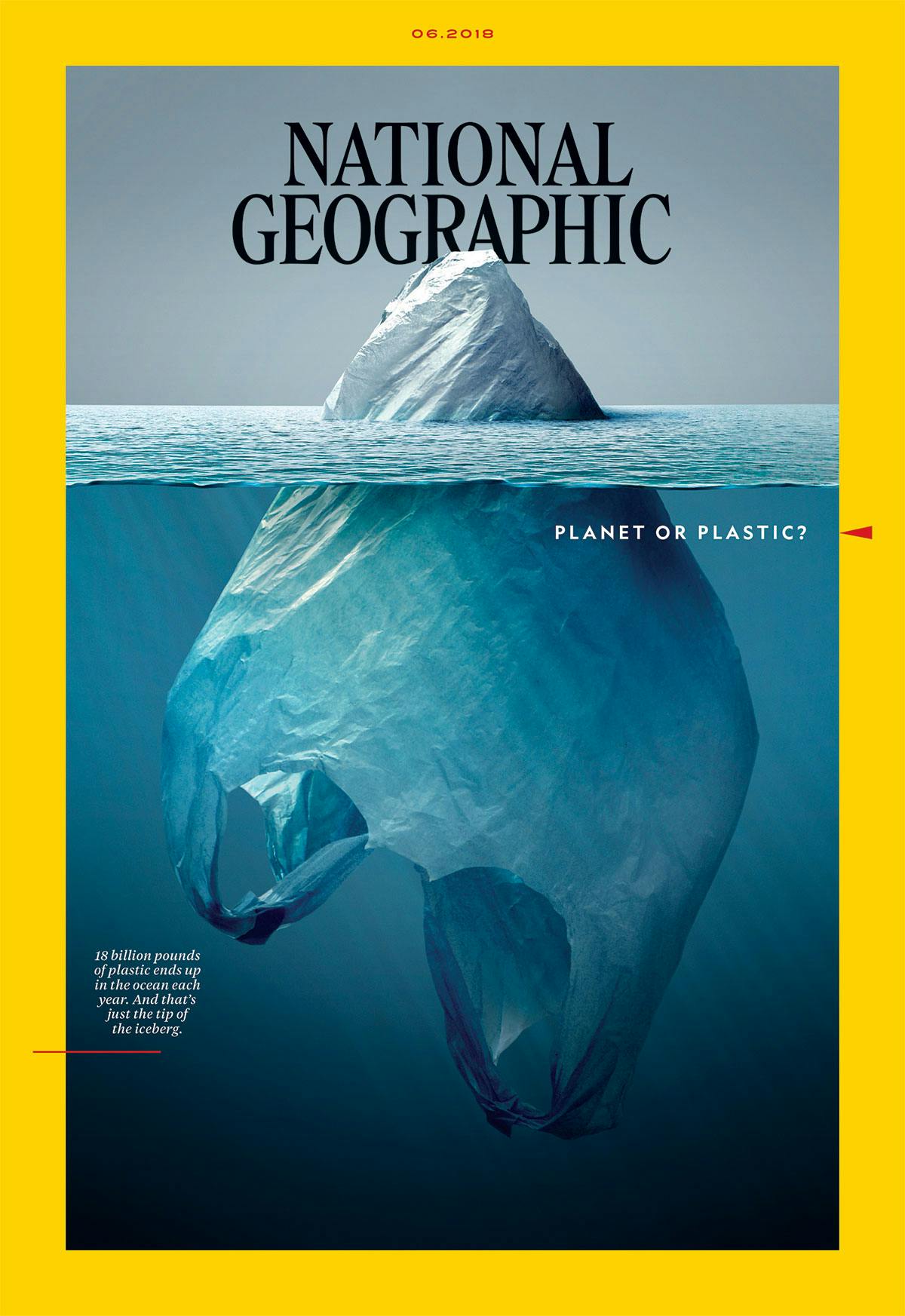 The June 2018 issue was dedicated to the Planet or Plastic? initiative; the cover featured a striking photograph of a plastic bag floating in the sea, shot by Mexican photographer Jorge Gamboa. The top half of the bag sticking out of the water looks eerily like an iceberg, becoming an unmistakable metaphor for the health of the planet. The powerful cover won much praise from readers, and stood out for conveying a clear message in a simple way.