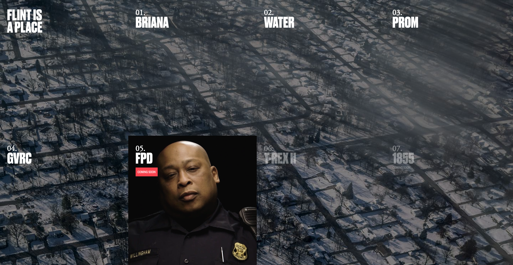 Flint is a Place is a cross-platform documentary series that explores the city and its problems in an intimate, character-driven way. The overall project uses a variety of media – film, photography, audio, design, VR – with stories finding their way into the world via partnerships with the likes of the New York Times and Netflix.