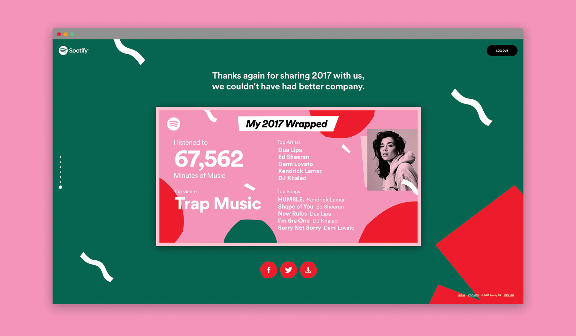 Your 2017 Wrapped allowed Spotify users to relive their year through music. Users were asked to guess who their top artist, top song, and top genre was. After unveiling the (no doubt surprising) results, the site then offered more data-based revelations including calculating the user’s ‘musical age’ and whether they skip songs more or less than the average listener. Included throughout were personalised playlists, including The Ones That Got Away – a selection of 2017 songs algorithmically selected for each user that they had somehow missed.