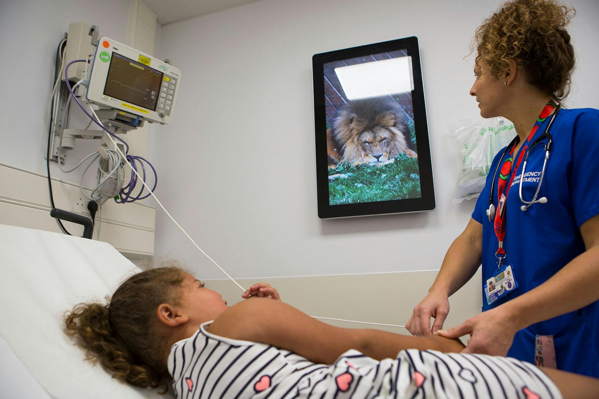 Filmmakers Accademia helped develop The Zoo, which features footage of 42 different animals, ranging from domestic to wild. London Aquarium, Colchester Zoo, Battersea Dogs and Cats Home, Battersea Park Children’s Zoo, and Hounslow Urban Farm partnered on the project. The film is displayed on 32-inch portrait screens in nine treatment rooms providing an intimate close-up of each creature, their expressions and features. As children can be in the department for many hours, The Zoo film is 90 minutes long on a seamless loop.