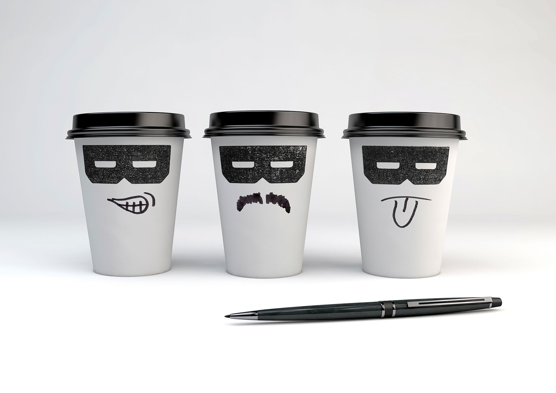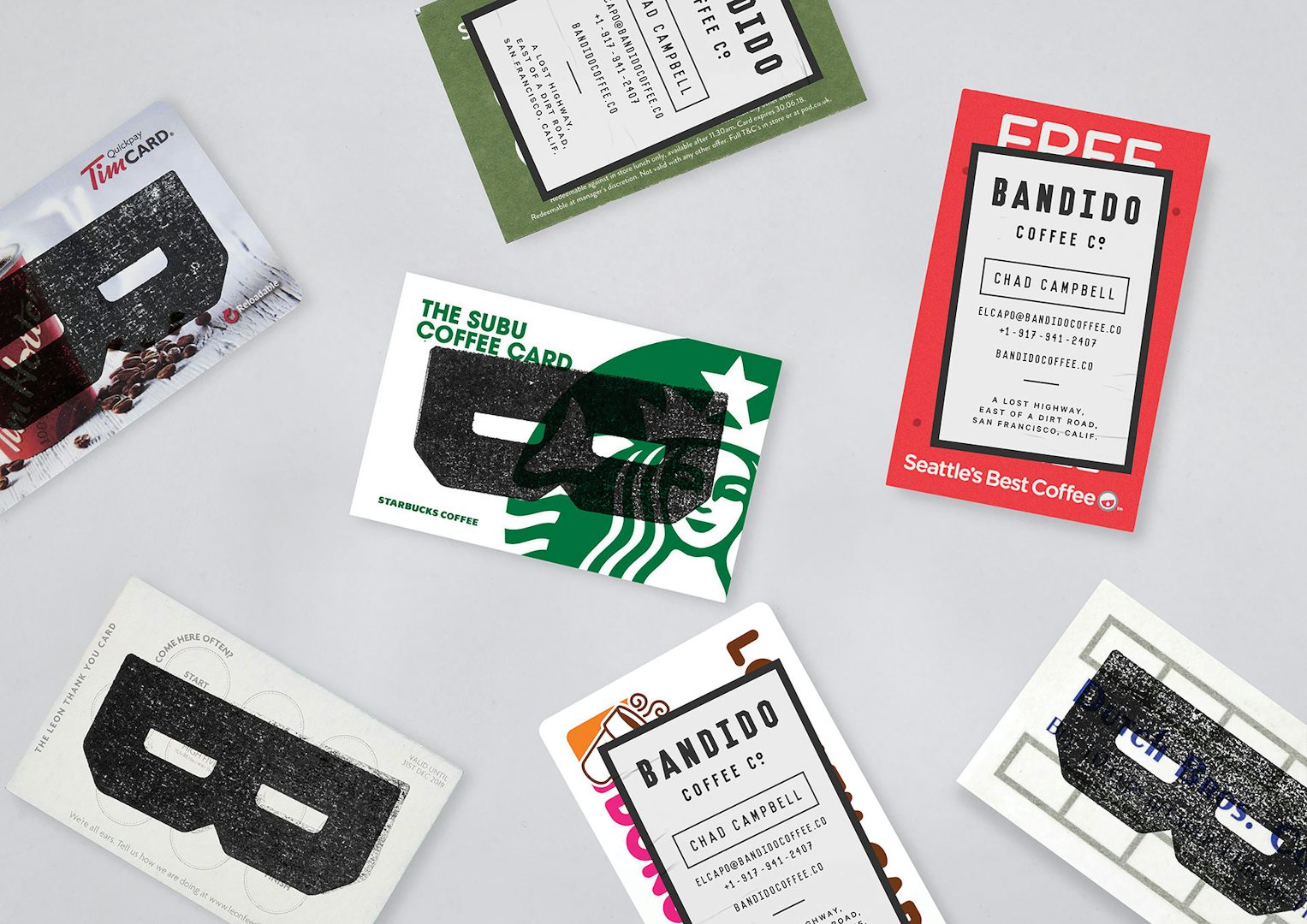Bandido is new independent coffee brand from Laurel Canyon, California. Its identity features a large letter B, turned on its side to resemble a bandit’s mask while, on the compostable takeaway cup, the black lid becomes a hat to complete the look. The mask device is repeated on celebrity photographs for marketing.