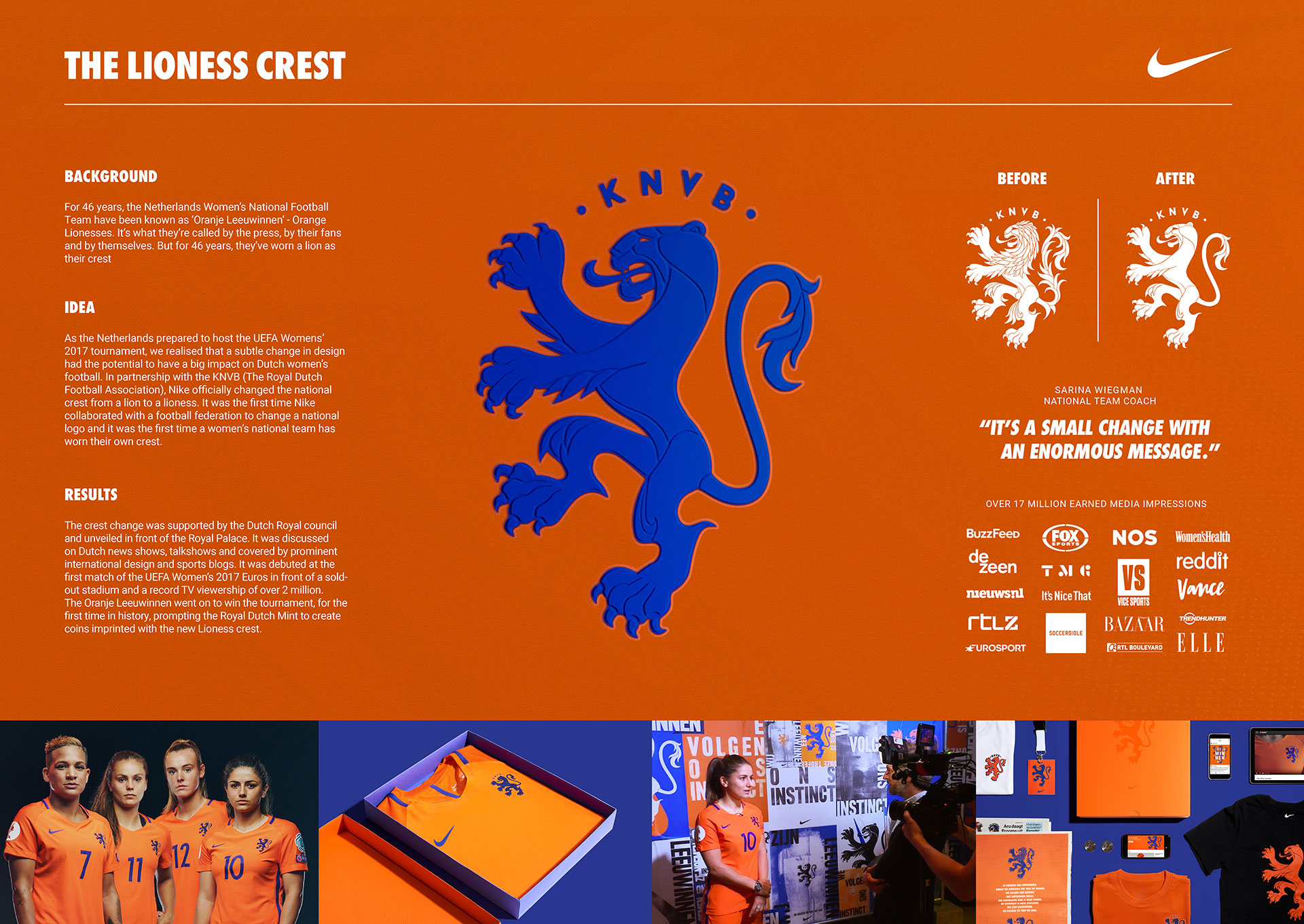 For 46 years, the Netherlands Women’s National Football Team, known as ‘de Oranje Leeuwinnen’ (the Orange Lionesses), had worn shorts bearing the same badge as the Dutch men’s team – a lion. For the UEFA Women’s Euro 2017 tournament, hosted by the Netherlands, Wieden + Kennedy worked in partnership with Nike and the KNVB (The Royal Dutch Football Association) to change the crest to a more appropriate lioness.