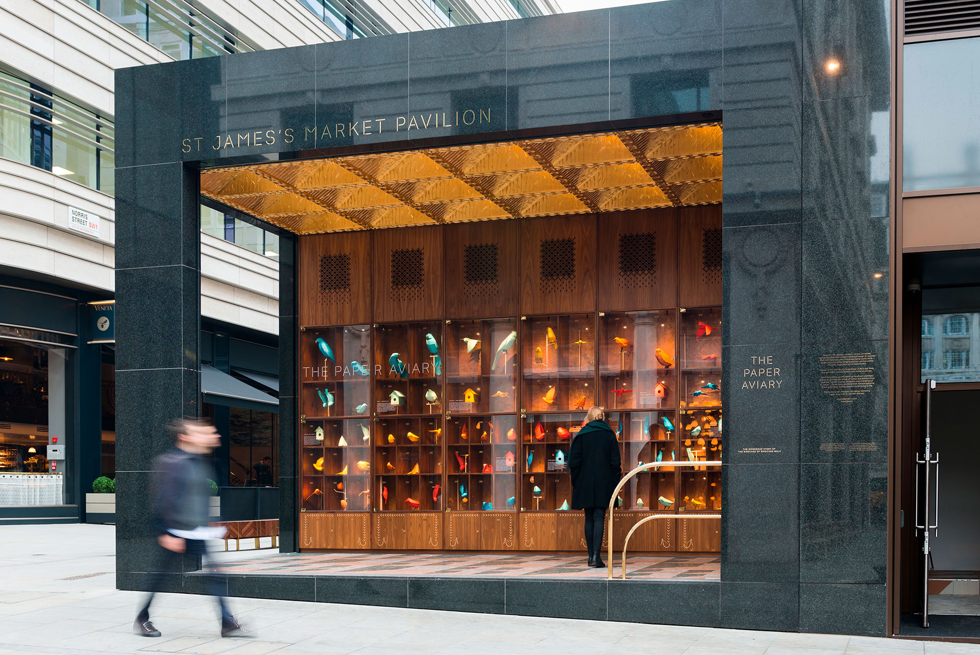 This installation was commissioned for St James’s Market Pavilion – a permanent art space designed in 2016 by Studio Weave in London’s St James’s. It takes inspiration from Charles II’s exotic birdcage, which housed his collection of tropical birds during the 1600s in the heart of St James’s Park and which lent its name to London street Birdcage Walk.