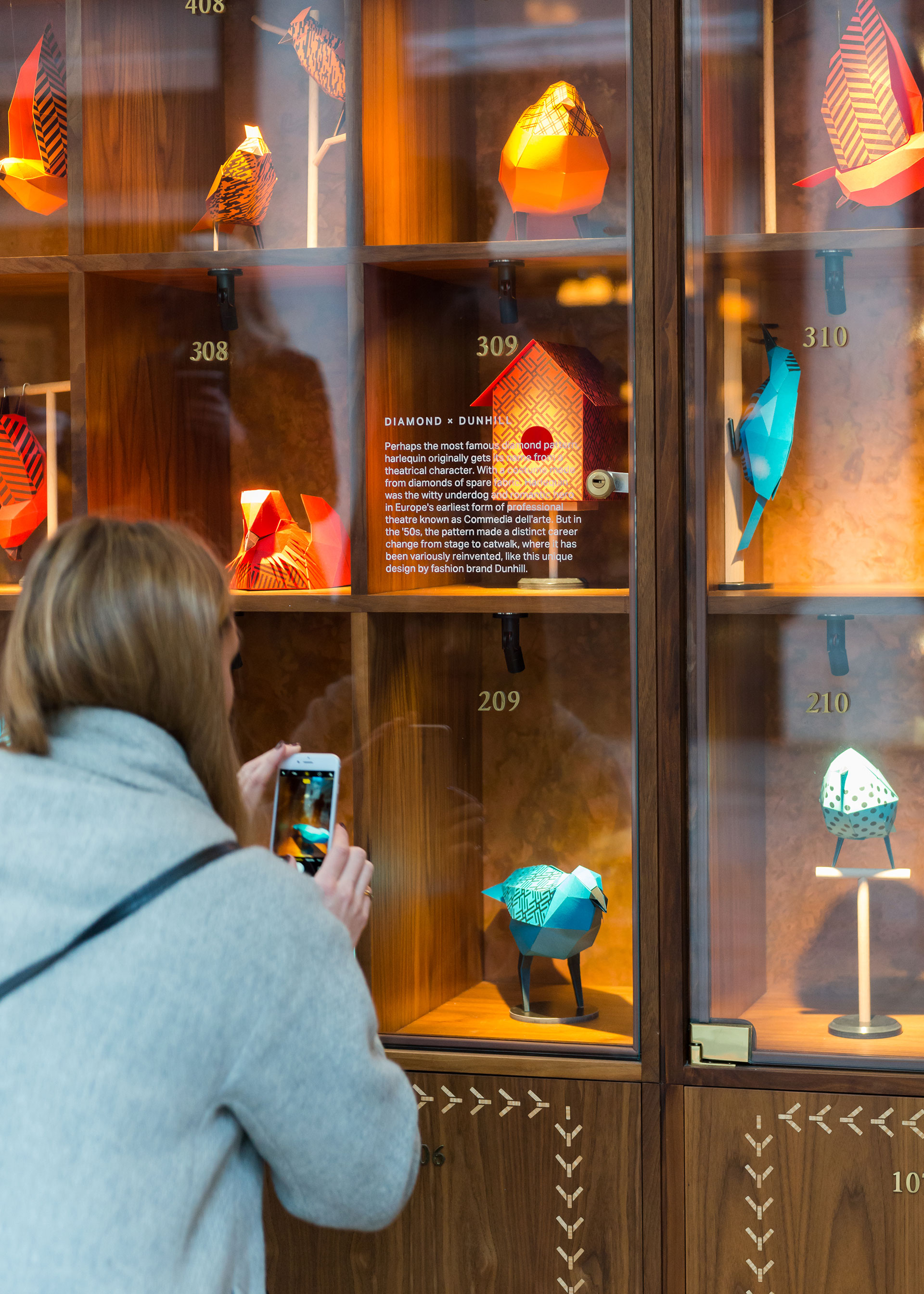 Each handcrafted bird displayed plumage and patterns inspired by the fashion houses and craftsmen of the area. Houndstooth, checks and polka dots were taken from the fabric patterns of brands such as John Smedley, Turnbull & Asser and Aquascutum. The exhibition featured a curated soundtrack of birdsong that brought the wild to the city.