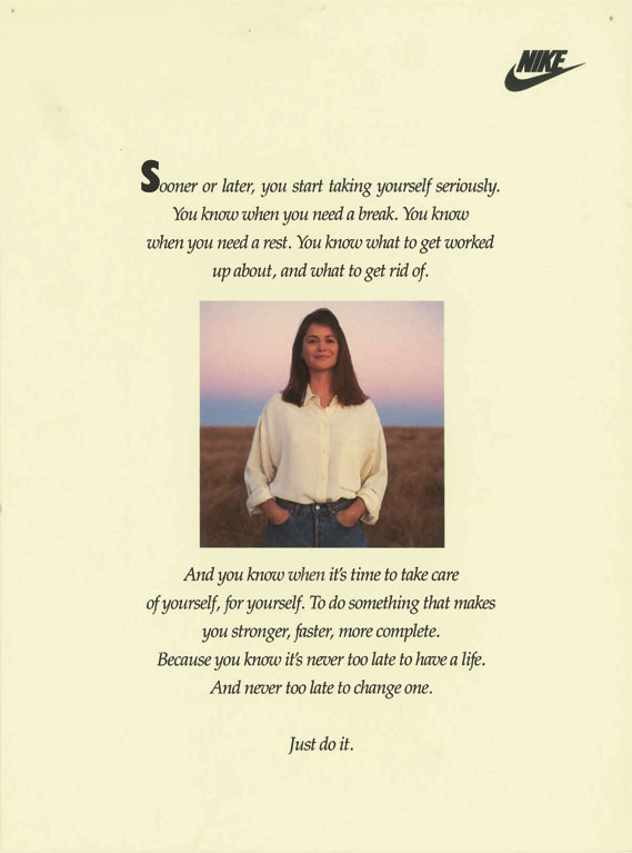 Considering how intrinsic to the brand it now seems, the slogan had inauspicious beginnings. It was created in 1987 by Wieden + Kennedy to accompany Nike’s first major television campaign, which included commercials for running, walking, cross-training, basketball and women’s fitness. “Each spot was developed by a different creative team and was markedly different from the others,” remembers Dan Wieden, founder of the agency and author of the Nike line. “In reviewing the work the night before the client presentation, I felt we needed a tagline to give some unity to the work, one that spoke to the hardest hardcore athletes as well as those talking up a morning walk.”