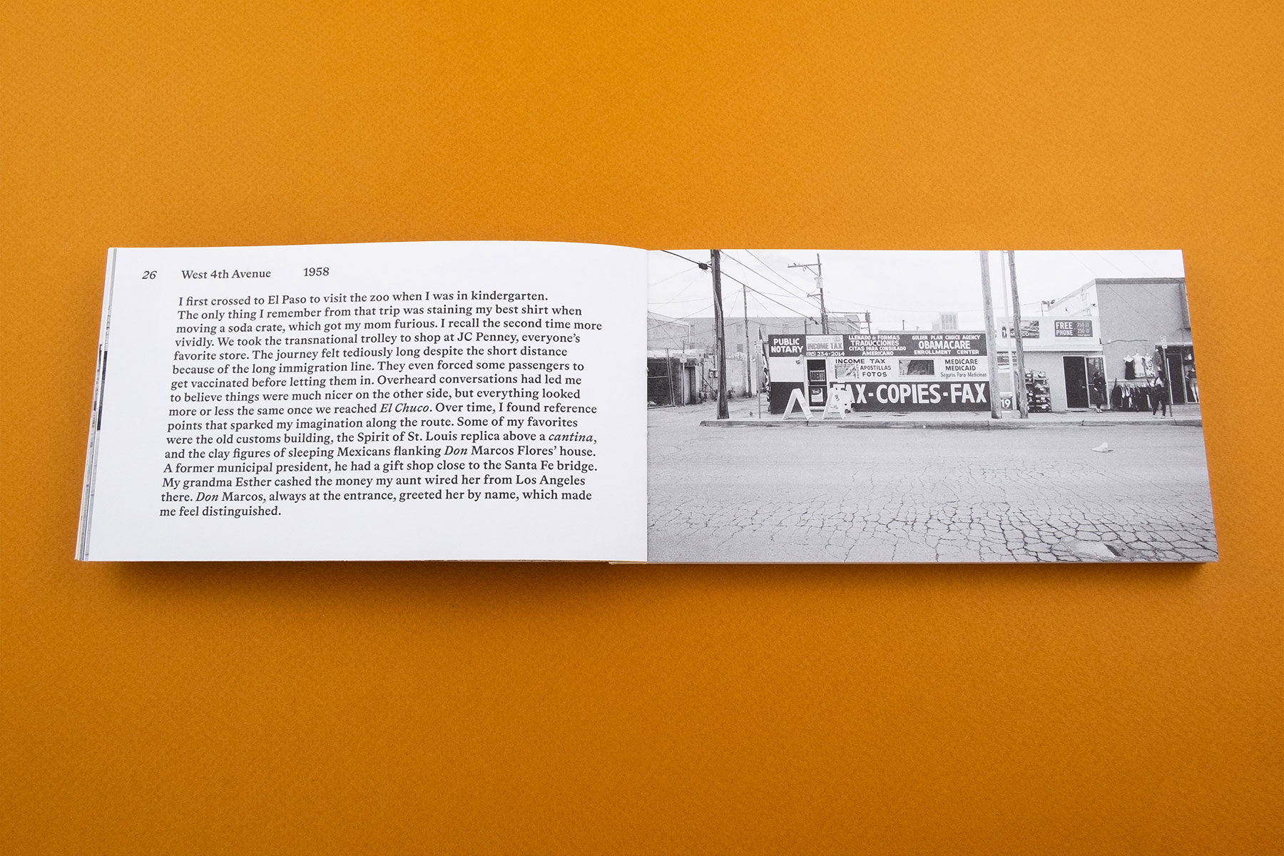 The sequencing of the book reflects this logic of interweaving. The narrative is structured chronologically, tracing the arc of his father’s life. But design choices sharpen the conceptual underpinnings: images of Ciudad Juárez always sit on the left-hand spread, while El Paso occupies the right, mirroring the physical relationship of the two cities while creating a visual rhythm across the book.